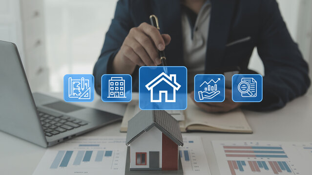 A businessman interacts with a holographic projection of financial data and futuristic home icons representing investment strategies for the year 2026 high quality professional