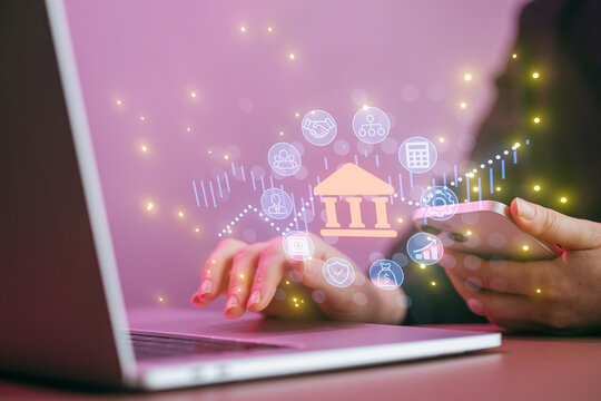 Person using smartphone near laptop with financial icons displayed on screen in a workspace setting for digital banking activities