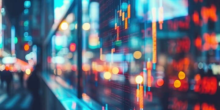 Close up of a glowing digital ticker displaying financial market data with numerical figures against a blurred urban background