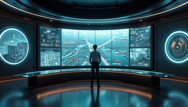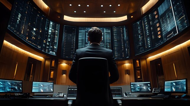 A businessman sits before a massive curved screen displaying complex data streams in a high tech control room.