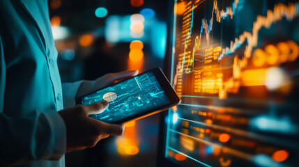 A business professional analyzes financial data on a touchscreen device in a modern office environment during nighttime