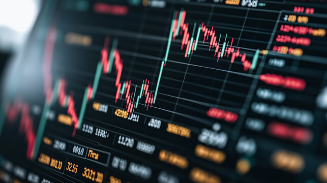 a blurred close-up view of a financial stock market graph on a digital screen with various data points and trend lines