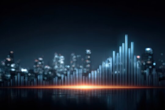 Abstract Financial Data Visualization with Glowing Bar Graph Over City Skyline at Night Blue and Orange Tones