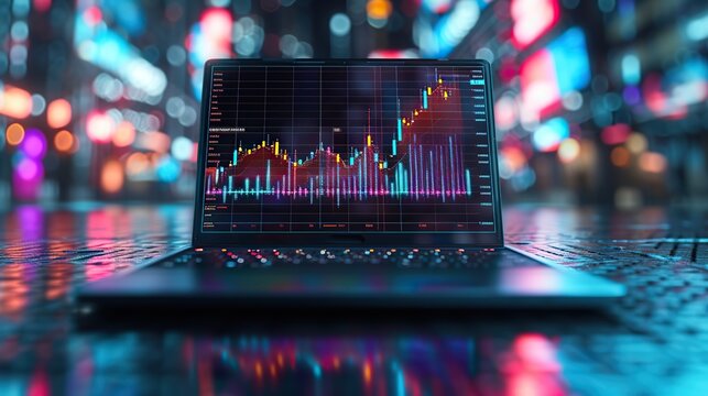 A laptop displays a vibrant stock market analysis graph on its screen, set against a backdrop of a cityscape bathed in neon lights.