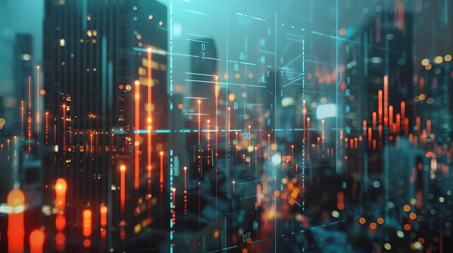 Digital stock market graph overlay on blurred urban cityscape background, showcasing financial data visualization in a modern metropolis setting.