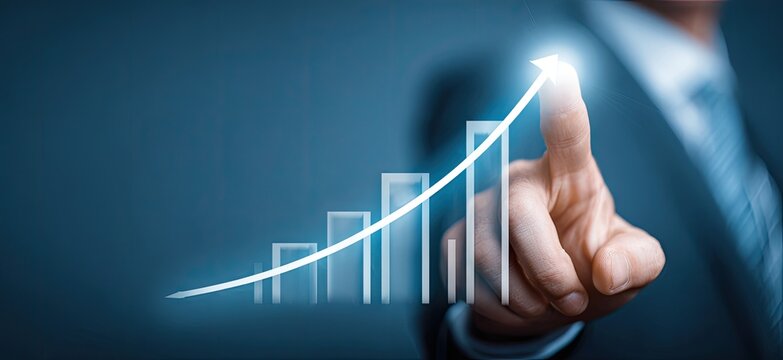 Businessman touching a glowing upward trend graph symbolizing financial growth and success.