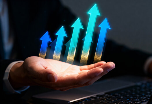 Futuristic digital growth concept with glowing arrows rising from a hand, symbolizing business success, innovation, data analytics, and financial development.