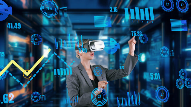 Woman reporter presenting news world market data rotating graph analysis VR future global innovation business interface digital infographic network technology virtual hologram at server. Contraption.