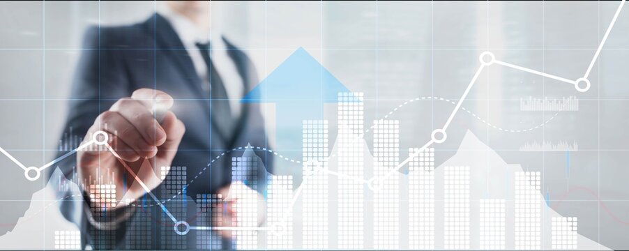 Business intelligence dashboard and arrows up, key performance indicators on a virtual screen computer interface