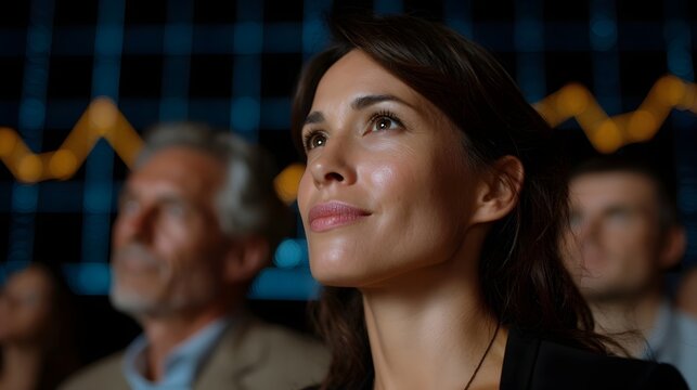 A woman looks up attentively in a dark room engrossed by a glowing digital data grid background with blurred audience members