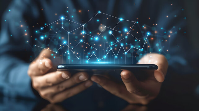 Businessman using a smartphone with digital business analytics displayed, highlighting data analysis and financial trends.