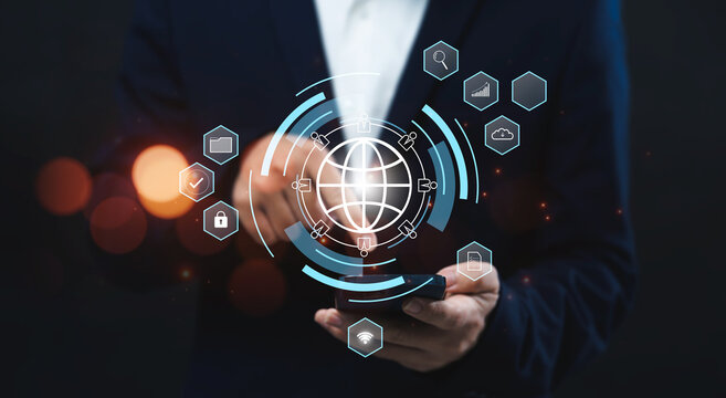 Businessman online internet sharing data transferring information with others, sharing files and documents using a mobile smartphone to store data safety online information computer system ICT.