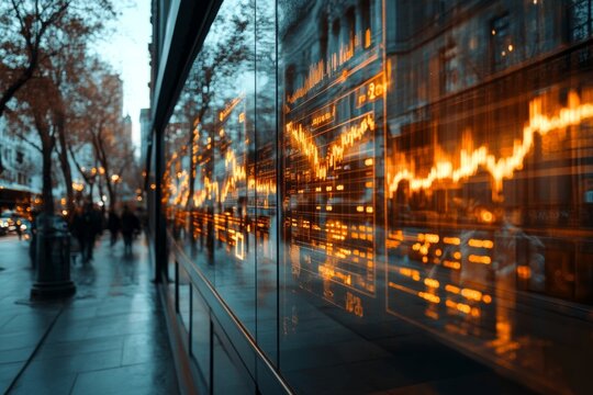 A glowing stock market graph reflects on the glass windows of a building, merging the cityscape with financial data in an urban environment during evening.