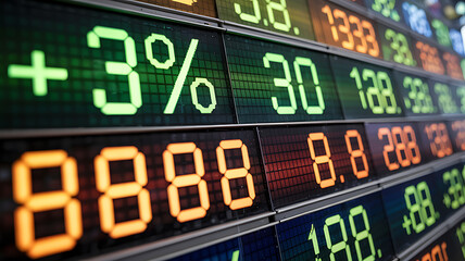 Close up view of a vibrant LED screen displaying real time market data financial indicators and fluctuating prices  The digital dashboard presents a colorful