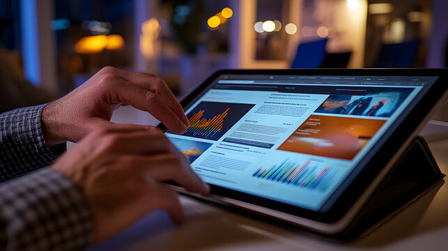 Businessman analyzing financial data on a digital tablet at night, displaying graphs and charts in a modern office environment.