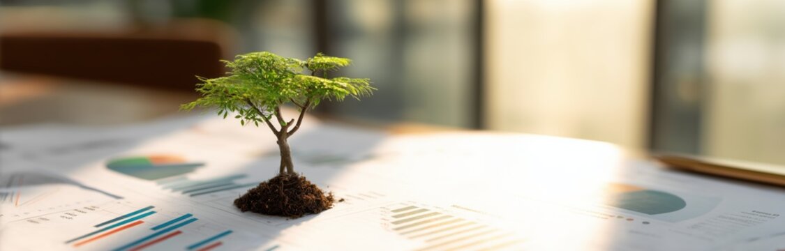 a miniature tree planted in soil, sitting on top of printed ESG data sheets and financial charts in an office environment