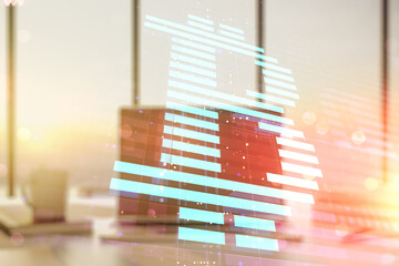 Creative Bitcoin concept with modern laptop background. Multiexposure