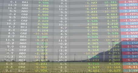 Showing wind turbines standing on rural farmland, with overlaid colored data codes and smokestacks