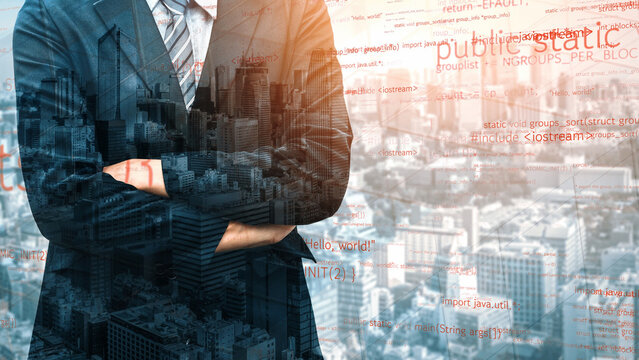 A professional businessman stands confidently with arms crossed, overlooking a vibrant cityscape. The image features a digital code overlay, symbolizing innovation and technology. Xenic