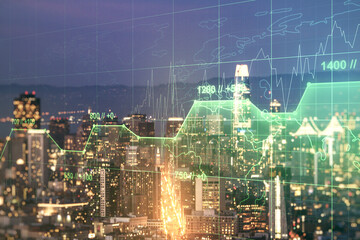 Abstract virtual analytics data spreadsheet on San Francisco cityscape background, analytics and analysis concept. Multiexposure