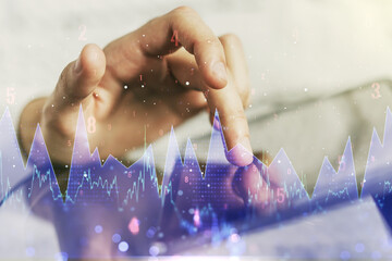 Multi exposure of abstract statistics data hologram interface and hand working with a digital tablet on background, computing and analytics concept