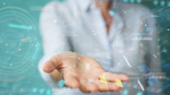 Woman using digital technological interface with datas 3D rendering
