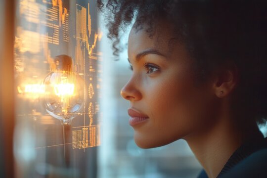 A woman gazes intently at a glowing screen displaying intricate data and graphs, representing technological advancement and insightful analysis.