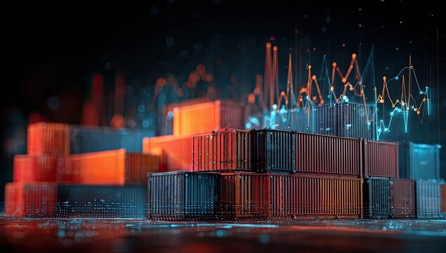 Stacked shipping containers with data visualizations illustrating import-export and logistics