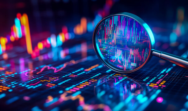 A magnifying glass over digital charts and graphs, representing data analysis in a stock market or financial business.
