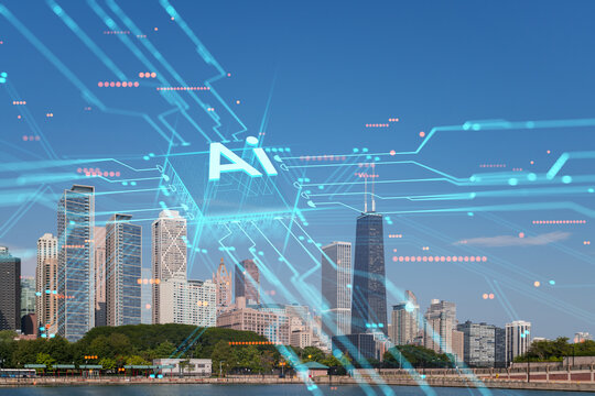 Chicago skyline with digital AI circuit overlay concept illustration.