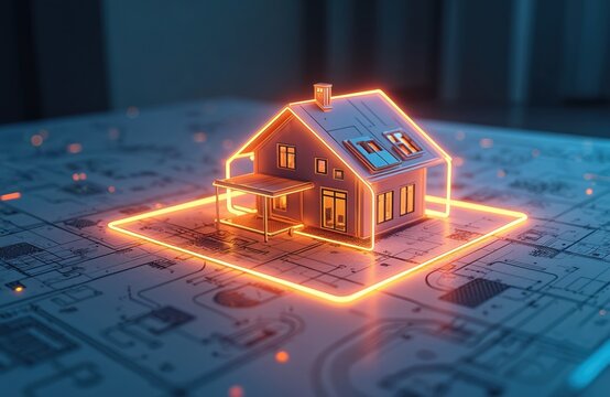 Futuristic smart home model glows on detailed architectural blueprints. Shows digital construction planning, innovative house design. Highlights modern tech integration, eco energy solutions,
