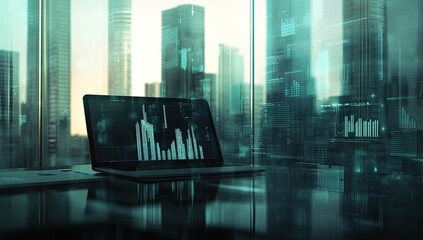Displaying dashboard overlaying skyline at dusk, showing purple charts and percentage indicators