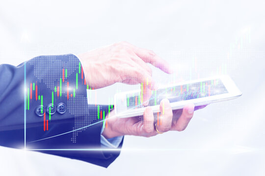Online investment concept with businessman hand using digital tablet and digital display with glowing financial graphs