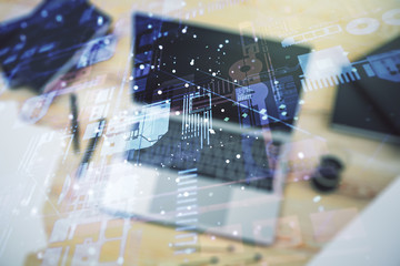 Multi exposure of abstract creative coding sketch on modern laptop background, artificial intelligence and neural networks concept