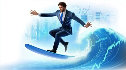 Businessman surfing on a wave of financial success in a futuristic cityscape setting with data analytics overlays