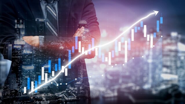 A professional businessman stands with crossed arms in front of an upward trending stock market graph, showcasing growth amidst a vibrant urban skyline. Copula