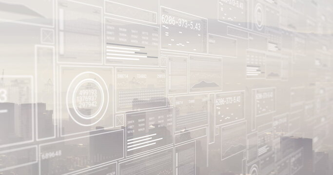 Image of interface with data processing and network of connections over aerial view of cityscape