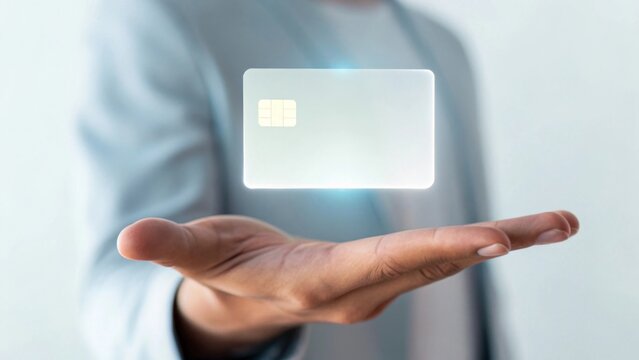 Innovative banking transition holographic credit card display in hand futuristic financial environment closeup perspective