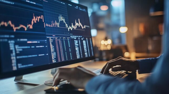 Person analyzing financial data on a modern computer screen during nighttime at a work desk in an office setting