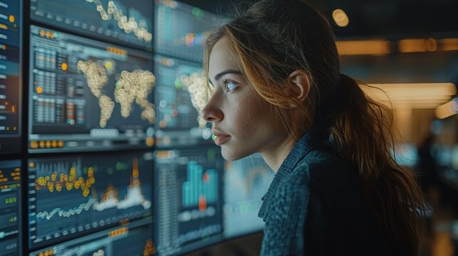 A tech professional intensely analyzes data on multiple computer screens, depicting a dynamic work environment driven by technology and information processing.