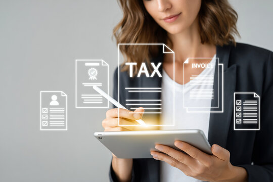 A young woman in business attire uses a digital tablet with a stylus, interacting with virtual icons representing tax forms, invoices, and checklists on a light gray background, generative ai
