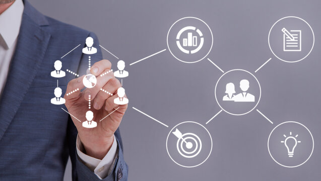 E-business concept. Unrecognizable entrepreneur touching white icons representing online business process on interactive screen, grey background