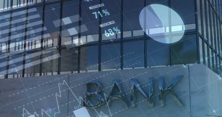 Image of financial data processing over modern bank building