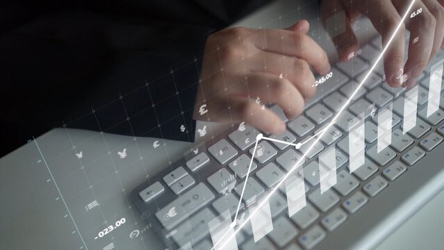 A close-up view of hands typing on a laptop keyboard with a financial graph overlay, illustrating growth and market trends in a digital trading context. Copula