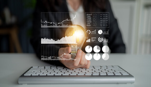 A businessman holds a light bulb while analyzing graphs and charts on a digital screen, symbolizing creativity and innovative solutions in a modern workspace. Impute