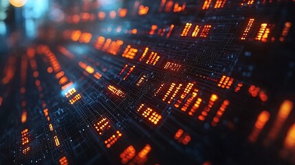 A captivating digital representation of a bustling metropolis, intricately woven with shimmering data streams, and complex technological framework at night.