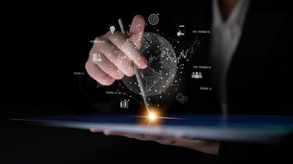 Closeup of a businessmans hand interacting with a digital interface displaying a globe surrounded by business icons, representing global connectivity and digital solutions