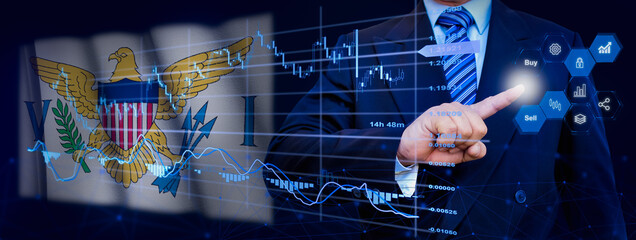 Businessman touching data analytics process system with KPI financial charts, dashboard of stock and marketing on virtual interface. With Turks and Caicos Islands flag in background.