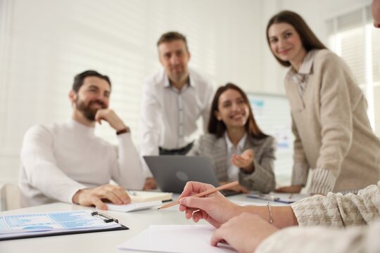 Businesspeople working together at table in office, selective focus