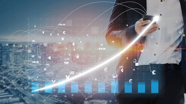 A businessman in a suit holds a smartphone while analyzing growth data, with a digital graph overlay and an urban city skyline in the background, emphasizing modern finance. Copula